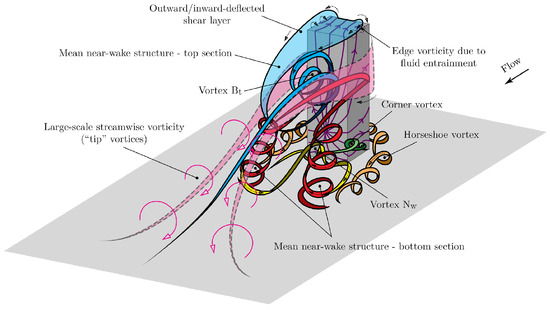Most recently, da Silva et al. (2020) [7] identified multiple mean wake structures, instead of a single arc-type structure, formed around a wall-mounted square cylinder (small depth-ratio prism) with at . As shown in Figure 2, it was suggested that these structures have different origins, contrary to the models discussed by Wang et al. (2009) [3]. Particularly, da Silva et al. (2020) [7] showed that the structures on the upper surface of the cylinder appear to fade, while wake tip vortices are formed because of three-dimensional deflection of the separated flow from the side leading edges of the cylinder. Moreover, there is a spanwise vortex structure named “B” that is formed by the folding of the separated shear layer from the free end leading edge of the cylinder. This newly identified structure has a different origin from the so-called legs of the arc-type structures. da Silva et al. (2020) [7] identified that the differences observed compared to the wake model of Wang et al. (2009) [3] may be attributed to the transitional nature of the latter wake compared to the mean wake considered in the lower Reynolds number study. These studies, although limited to small depth-ratios, have revealed that, depending on the cylinder aspect ratio and Reynolds number, there are multiple structures formed in the wake with distinct characteristics.
