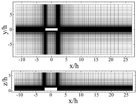 The streamwise (x-), spanwise (y-), and normal (z-) dimensions of the computational domain, shown in Figure 3, are h, h, and h, respectively. The front face of the body is located h from the inlet and h from the outlet. The constant uniform velocity is applied as the inlet boundary condition. Sides and upper walls of the domain are set to slip boundary condition. The outlet boundary is set as the Neumann boundary condition (, where is any flow variable). The no-slip boundary condition is applied to the ground and body faces.