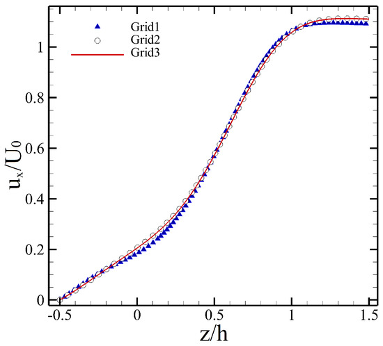 The domain size is known to affect numerical results, and so does the spatial grid quality [26]. To address the former, the computational domain was designed such that its size exceeds those of Shah et al. (1997) [27], Krajnovic et al. (1999) [28] and Yakhot et al. (2006) [29] for a single cube, and Krajnovic et al. (2005) [30,31] for an Ahmed body. Furthermore, the sensitivity study on the computational domain size was based on three domains for the long prism. The grid quality analysis was carried out using three grids for the long prism as well. More details on these sensitivity studies can be found in Zargar et al. (2020) [32]. Here, only a summary of the verification and validation studies are provided for brevity. Table 1 shows the comparison of the grid quality in the current study with other similar studies of the flow around a rectangular prism or an Ahmed body model. The streamwise velocity profile calculated at a constant distance from the prism rear face is presented in Figure 5, which illustrates that the difference between Grid 2 and Grid 3 is less than . The grid-quality sensitivity analysis indicated that Grid 3, which is the mesh used in the current study, is sufficient for capturing the main global flow features.