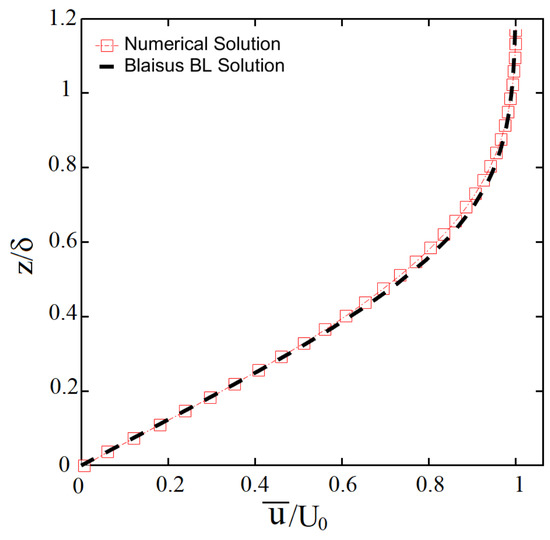 In an effort to validate the simulations in the absence of experimental data for this specific case, a similar “validation case study” was completed based on a square prism of aspect ratio 4 to compare with the DNS results of Saha (2013) [15] and Zhang et al. (2017) [9]. The calculated drag coefficient for the validation case is equal to , which is very close the reported value of by saha (2013) [15]. Furthermore, as shown in Figure 6 and, the profile of stramwise and spanwise velocity collapse well with the result of Saha (2013) [15] and Zhang et al. (2017) [9] with small discrepancies. To further analyze the validity of the results, Figure 7 compares the numerically computed boundary layer in the present study calculated at and with the analytically determined Blasius boundary layer solution. The good agreement between these results indicates that the simulations are adequate in capturing the main flow features.