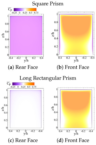 Distribution of on the rear and front faces of the (a,b) square and (c,d) long prism.