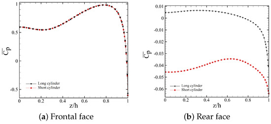 This study focuses mainly on characterizing the wake of a large depth-ratio prism at the highest Re considered here, while comparing the wake topology to well-established wake of small depth-ratio (square) prisms. The longer surfaces of the long prism is expected to motivate reattachment of the shear layer formed on the leading edges of the prism. This hints at potentially major alternations to the wake. To begin, we look at the integral flow parameters, such as the coefficients of drag and lift, defined as forces acting in the positive x- and z-directions respectively, at . The results showed that drag and lift coefficients are altered by the larger depth-ratio of the rectangular prims compared to the square prism. As shown in Table 2, the drag coefficient increases from for the square prism to 1.05 for the long prism. To find the source of this change, the distribution of pressure on the front and rear faces of the prisms are depicted in Figure 8. As expected, the pressure distribution on the front face of both prisms are fairly similar since the freestream characteristics mostly dictate the pressure of the front stagnation region. Conversely, the pressure distribution on the rear face of the two prisms strongly differ, which hints that the wake flow characteristics vary between the two bodies. Magnitude of the pressure coefficient on the rear face of the long prism is larger than that of the square prism. Furthermore, Figure 9 presents the pressure distributions across the rear and frontal face of the prisms on the symmetry plane (). As shown, the pressure coefficient on the prisms’ front face are identical for both cases, while pressure is larger on the back face of the large depth-ratio prism. This implies that the increase of drag observed for the longer prism does not relate to a larger pressure drop in the wake. Thus, the additional drag must intuitively relate to larger frictional forces on the side and upper faces of the long prism.
