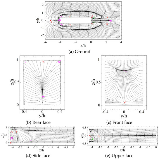 Focusing on the flow field and main characteristics of the wake, the critical points on different faces of the long rectangular and square prisms are shown in Figure 10 and Figure 11. The critical points are determined by streamlines of the velocity vector at the first cells from the walls. The nodal, saddle and focal points are identified as N, S, and F, respectively.