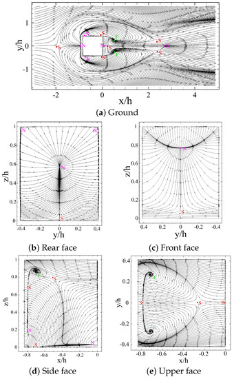 There is, however, a different wake topology expected for the square prism (short prism), in which case the result of Equation (6) is two instead of zero, according to Liakos et al. (2014) [37]. Based on the visualization of the critical points around the square prism in Figure 11, the total number of nodal, focal, and saddle points around the square prism are 13, 6 and 17, respectively. Thus, subtracting S from is equal to 2, which agrees with the findings of Liakos et al. (2014) [37]. It appears that two pairs of saddle points that are present on the side of the long prism (see Figure 10a) are merged in the case of the square prism. This leads to a decrease on the number of the saddle points compared to nodal points for the square prism, which indicates that Equation (6) can be different for a wall-mounted object based on the conditions of the study. Furthermore, there are some differences between the distribution of critical points on the wall-mounted cube in Liakos et al. (2014) [37] and the square wall-mounted prism in the current study. For example, they reported the presence of some saddle and nodal points on the edge between the front face and the ground close to the side face of the prism. However, these critical points are not observed for the square prism in the current study. These differences between the two cases are expected due to the differences in the geometries and thicknesses of the boundary layer. Moreover, comparing with Liakos et al. (2014) [37], the distribution of critical points on the long prism at is similar to the distribution of critical points on a cube at . Looking at the results in Figure 10b and Figure 11b, the nodal and saddle points on the rear face of the square prism (at ) are formed farther from the ground compared to the long prism. This difference can be attributed to the more significant upwash flow in the wake of the square prism, which will be discussed later. It is also notable that there is not any saddle point on the upper rear face of the square prism. Alternatively, as shown in Figure 11e, there is a saddle point on the ending part of the upper face of the square prism, which indicates that there is a small region of reversed flow towards the trailing edge of the square prism upper face. Another significant difference of the distribution of critical points on faces of the short and long prism is that there exists an additional attachment nodal point and a saddle point behind the square prism in Figure 11a. The attachment nodal point is formed because of the interaction of the separated shear layer with the rear face of the prism. The saddle point is also the result of the interaction of the former nodal point and the last nodal point of the wake region.