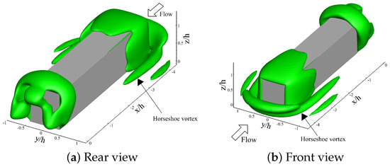 The iso-surface of the Q-criterion, normalized using the prism height (h) and freestream velocity () and denoted by , are shown in Figure 12 and Figure 13 from two perspectives: the front and rear views of the prism. The plots in Figure 13 identify that the separated shear layer from the leading edge of the square prism is connected to the wake structures, which agrees with the existing models [3]. For the long prism, however, the structures are separated between the leading and trailing edge of the prism in Figure 12. Furthermore, the legs of the horseshoe vortex are extended into the wake and interact with the structure formed behind the square prism. This can directly impact the wake dynamics. Conversely, the wake structure of the long prism is located at a relatively long distance from the legs of the horseshoe vortex. The shorter depth of the square prism allows for interaction of the wake structures on the trailing edge of the prism, while the horseshoe vortex legs formed around the long prism are highly distorted and lack coherence at the trailing edge of the prism. Thus, there is no interactions between horseshoe structures and the wake behind the body. This differs from the square prism wake model.