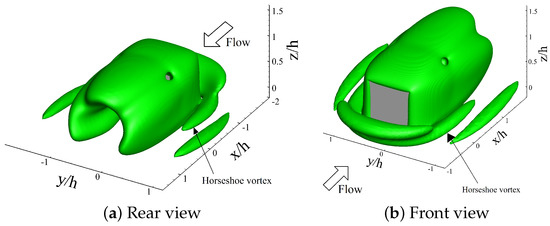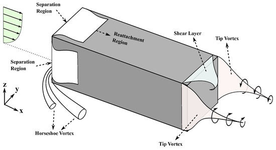 - Sattari, P.; Bourgeois, J.; Martinuzzi, R. On the vortex dynamics in the wake of a finite surface-mounted square cylinder. Exp. Fluids 2012, 52, 1149–1167. [Google Scholar] [CrossRef]