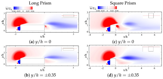 The effect of large depth-ratio on upwash flow is apparent in Figure 14, where there is evidence of a strong upwash flow for the square prism and not the long prism. The upwash effect in the wake of the long prism is very narrow and limited to the vicinity of the prism rear face (see Figure 14a,b). This change in the wake behavior is associated with the change in interaction between the horseshoe vortex and the tip structure at the trailing of the prism. Moreover, this provide further evidence in comparison to the larger aspect ratio prisms, i.e., in Saha (2013) [15], that the height of the boundary layer at the prism rear face plays an essential role in the wake flow characteristics. Another critical difference between the two prisms is related to the downwash flow in the middle of the long prism, where there is a stronger downwash effect in the outer regions. This observation is also supported by the streamline plots on 2D planes of Figure 15. This implies that the entrainment of the freestream flow due to the separated shear layer increases the strength of the upwash and downwash flow. However, its effect on the upwash flow is more apparent near the symmetry plane, whereas its effect on the downwash is more evident close to the junction of the side and rear faces.