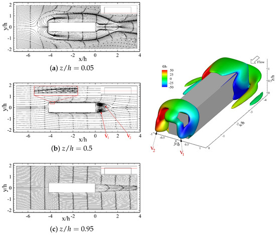 As shown in Figure 15 and Figure 16, the cross-flow in the wake is symmetric for both prisms. However, the presence of the boundary layer effects along the z-direction leads to a strongly antisymmetric wake in the normal (z-) direction. In the normal mid-plane of the prism (middle plane in the z-direction), there are focal points that correspond to laminar vortical structures in the wake (see Figure 16b). It can be seen from the contours superimposed on the isosurface of Q-criterion (Figure 15 and Figure 16) that the rotational motion of the wake structure at a lower height (close to the ground) and higher part of the long prism are restricted to the z- and y-directions, respectively. The interconnection of these structures, which is apparent from the combination of 2D (streamline and contours) and 3D (iso-surface) visualizations, implies that their behavior is within a single structure that deforms and diffuses in the wake. The separation bubble close to the leading edge of the body is highlighted in Figure 15a, on the mid-plane of the prism, which does not extend into the outer wake. This implies that the reattachment on the prism upper face is stationary and it does not contribute to the tip structure typically formed on the prism rear, as per the model of Wang et al. (2009) [3]. There also exists the same separation bubble on sides of the long prism (Figure 16b) as it was also observed on the top face of the prism in Figure 15a. The side-bubbles also appear on the mid-plane for the prism, similar to the top-face bubble. Comparing such behaviors to the wake of the square prism in Figure 17 and Figure 18, there is a similarity in the formation of bubbles on top and side faces of the prism. However, there appears to be a larger laminar structure in the outer wake of the square prism, which leads to a large flow entrainment (downwash flow) compared to the long prism. The center of the wake structure behind the square prism in Figure 17b is h farther away from the rear face of the prism compared to the long prism in Figure 15a.