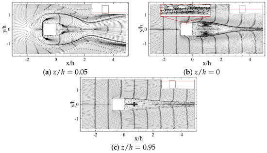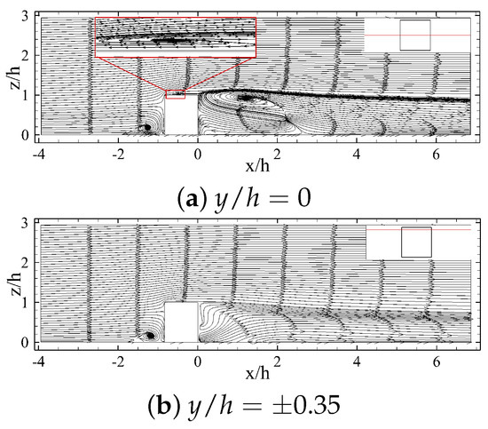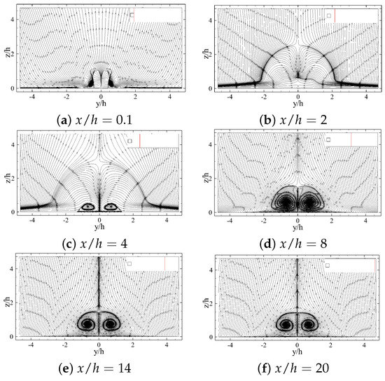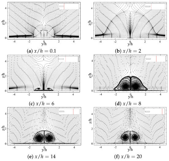 For a better understanding of the vortex structures around the body, two-dimensional streamlines along different planes perpendicular to the streamwise direction (cross-sectional planes) are shown in Figure 20. Two counter-rotating vortical structures are observed behind the long prism, which expand by moving farther away from the body. Since the rotational direction of these structures creates a downwash flow in the mid plane region (), to follow the existing definitions for tip vortex structure [1], these vortices should be tip vortices. Thus, it seems that the small aspect-ratio of the considered prisms leads to the elimination of the streamwise base vortices in the wake region, although the upwash flow dominates the near wake region of the prisms (see Figure 14b,d). These rotational flow transforms into a pair of streamwise vortical structures within h from the prism, which quickly grow to the same size as the prism height within 8 h downstream (Figure 20d). These streamwise vortices appear steady and with minimal diffusion far into the wake, in Figure 20f.