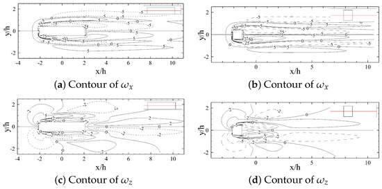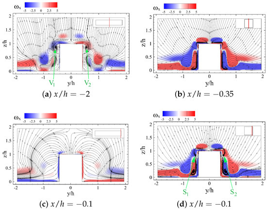 Figure 21 shows the 2D streamlines on -planes at different streamwise locations in the wake of the square (short) prism. There is clearly a different streamwise vortex formation mechanism at the rear face of the square prism compared to the long prism (see Figure 20a and Figure 21a). This is mainly due to the large streamline curvatures on the -plane that entrain the fluid into the wake and trailing structures. There are evidence of streamwise horseshoe vortical structures in the immediate wake of the square prism, which diffuse rather quickly within 1 h into the wake. The tip vortices in the near wake region are different (see Figure 20c,d and Figure 21c,d). Downstream at , however, the tip vortices are very similar to those of the long prism, whereas the structures are relatively smaller in the wake of the square prism. The main wake characteristics remain similar for both prisms, i.e., wake symmetry and steadiness.