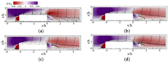 Streamlines on a side view (-) of the long prism () at highlighted by the normal component of the velocity vector at (a) 50; (b) 150; (c) 200 and (d) 250.