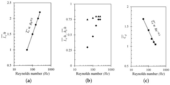 The variation of (a) wake size ( as •), (b) height of the mean wake structure ( as ▲), and its distance from the rear face ( as ⧫), and (c) mean drag coefficient ( as ⯀) at a range of .
