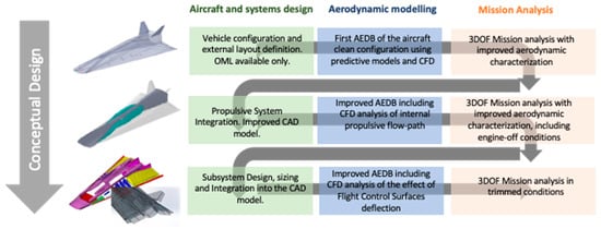 Specifically, after this short introduction, Section 2 briefly provides the reader with a summary description of the STRATOFLY MR3 vehicle configuration and its reference mission. Then, Section 3 focuses on the step-by-step aerodynamic characterization of the vehicle from the clean to the complete vehicle configuration. Even if the aerodynamic characterization approach is well-known, Section 3 points out specific innovative aspects which have been introduced to better cope with the analysis of a highly integrated waverider configuration at conceptual design level. The build-up approach starts from the investigation of the clean configuration, which consists of the external vehicle layout, including empennages and undeflected control surfaces. Inviscid CFD simulation techniques are applied to better describe the subsonic and transonic regime. Complementary, an updated mathematical formulation for viscous effect corrective factor is disclosed. In the following steps of the build-up approach, the contributions of the internal flow-path of the propulsive system, and of the deflected control surfaces are evaluated and added to the clean configuration. These last steps are extremely important for highly integrated vehicle waverider configurations where the propulsive subsystems flow-path may represent up to 30–40% of the vehicle available volume and where non-conventional flight control surfaces architecture may be adopted. The importance of properly addressing these contributions for the aerodynamic characterization of the vehicle is testified in Section 4, the comparison of the results obtained through the different mission analysis campaigns clearly shows that the accuracy of aerodynamic characterization may determine the feasibility or unfeasibility of the mission concept. In this context, special attention is devoted to the longitudinal stability analysis, which shows that in order to meet the high-level design and operational requirements (such as maximum take-off weight and range), the stability concept should be relaxed into the low supersonic speed regime. Finally, ideas for future investigations are reported and main conclusions are drawn.