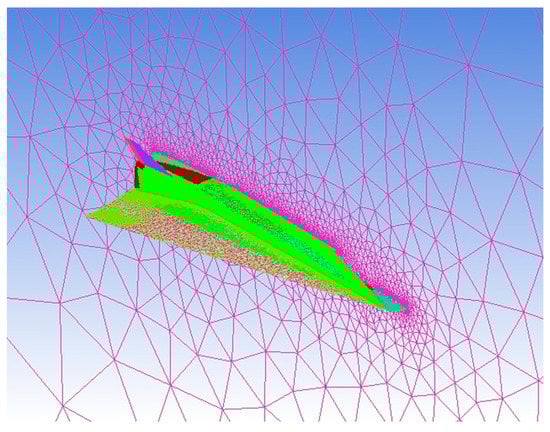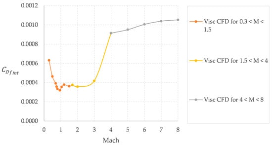 Considering the substantial differences between STRATOFLY MR3 and the Space Ship 2 configurations, a new formulation of the parameters has been considered. Firstly, the peculiar shape of STRATOFLY MR3 prevents use of Equation (4) for the entire vehicle configuration, but it allows for applying it only at the external surface. Therefore, in this case the vehicle presented an integrated propulsive flow-path, the ratio will be evaluated by considering the external wetted area only, without taking into account the integrated propulsive flow-path, which characterizes STRATOFLY MR3 configuration. For STRATOFLY MR3, this leads to a value of about 2.31. Then, and coefficients have been tuned to use a set of viscous CFD simulations carried out at angle of attack zero all over the range of Mach number. To achieve reliable results, the previous grid (Figure 3) has been stretched close to the vehicle wall by adding a prism layer and thus reaching a total number of cells of about 3.2 million. The k-ω-SST turbulence modeling, which can be used for a wide range of fluid flows as in the present calculations (see [13]) has been adopted. Pressure-far-field conditions have been applied for the external surfaces of the domain (assigning Mach number, pressure, and temperature), while the surfaces of the vehicle are treated as no-slip adiabatic walls. The AUSM scheme (upwind) for numerical convective flux is used, coupled with a density-based approach and an implicit time discretization that allows for higher than 1 CFL number (up to 6). Considering that viscous CFD runs require much more CPU time than the inviscid Eulerian ones, the viscous CFD runs have been performed only at angle of attack zero for the tuning of previous formula (Equation (4)). Results of the viscous external CFD simulations carried out throughout the reference trajectory are reported in blue in Figure 6. The strange behavior of the curve for low Mach numbers is mainly due to the fact that for each Mach number, the CFD simulation has been conducted keeping the real flight altitude, resulting therefore in a different Reynolds number. In order to make the tuning easier, the CFD results have been scaled to the same Reynolds number (the value of Mach 0.3, which is 6.54 × 108) as reported in green. At the same time, the predicted using the original formulation has been plotted (see the grey line). Eventually, and coefficients have been tuned to better predict the trend of the green line through the analytical formulation, thus obtaining a new modified analytical formulation, which is more accurate for wave-rider configurations. The curve obtained at the end of the tuning process is reported in red, and it corresponds to Equation (4) with and .