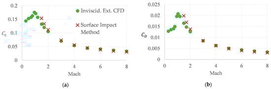 Some results are reported in the Figure 4 and Figure 5 where the results of the inviscid external CFD simulations are compared with already available results previously obtained by means of Supersonic/Hypersonic Panels Method (Surface Impact Method tool), based on classical Modified-Newtonian, Tangent-Wedge, and Shock-Expansion Theories. In the supersonic-hypersonic range down to Mach = 3, the comparisons show good results, at least for small angles of attack (i.e., the case reported in Figure 4 and Figure 5). The discrepancy between the two methods is expected to increase for higher angles of attack. However, this is not the case for the STRATOFLY MR3 vehicle whose angle of attack throughout the mission is between −2° and +2°.