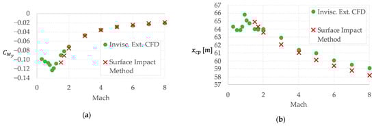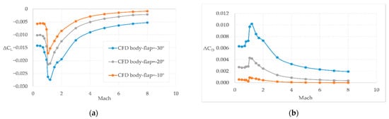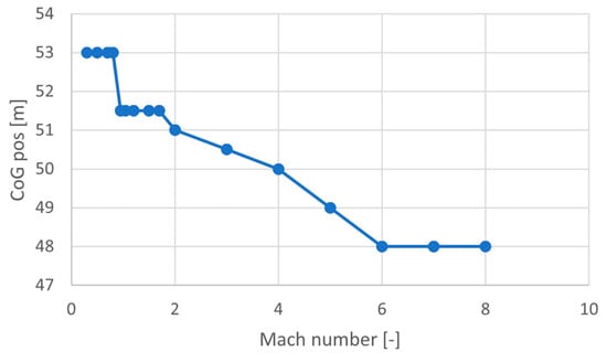 Canards and flaps deflection ranges between −20° and +20°, while the bodyflap deflection is in the range −30°/0°. The resulting total CMy is evaluated for each possible combination of surfaces deflections and for the entire Mach range. The aim is to understand which conditions guarantee longitudinal static stability, namely , at a given Mach number and CoG position. The latter is derived from the preliminary CoG shift model which has been evaluated by PoliTO. A specific value of the CoG position is considered for each Mach number, as reported in Figure 21.