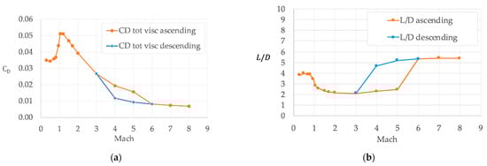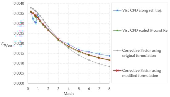The parametric formulation reported in Equation (4) allows for the estimation of the viscous effect by correcting the turbulent flat plate theory (represented by the term , see [10]) with (i) the factor which takes into account the compressibility effect [11], (ii) the wetted and the reference areas ratio and (iii) the parameter will be customized depending on the vehicle configuration. In the original formulation which was used to support the Space Ship 2 Aerodynamic Characterization [12], the values suggested for these parameters are as follows: = 0.144, and .
