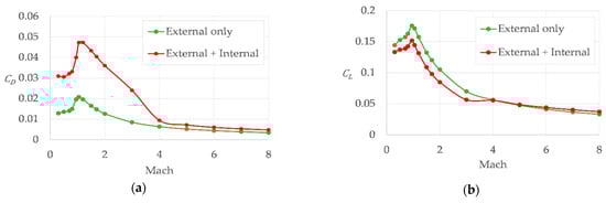 Drag (a) and Lift (b) coefficients versus Mach at α = 0°. Comparison between full part and external part.