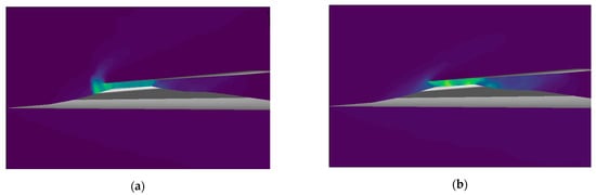 The sudden reduction of drag at M = 4 (Figure 8a) can be explained because the combustor swallows the shock wave, and in addition, the intake down-lift disappears (Figure 8b). The swallowing of the shock wave provides the aerodynamic characteristics with a hysteresis phenomenon, as can be seen in Figure 9. The investigated configuration shows that the shock wave is captured by the combustor between Mach 5 and Mach 6 during the ascent trajectory, while it is expelled between Mach 4 and Mach 3 during the descent trajectory. This different behavior of the air-intake can be noted in Figure 10 where we can see the Mach number contours at M = 4 and AoA = 0° far field conditions during ascent and descent phases. However, looking at the envisaged in-flight operations of the MR3 propulsion subsystem, only the descending branch of the hysteresis graph has been considered. Indeed, the ATR ducts are expected to be open, thus facilitating the entrance of the shock wave into the combustor between Mach 3 and Mach 4.