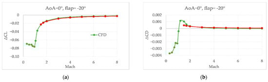 ΔCL (a) and ΔCD (b) due to the flap effect at α = 0° and flap = −20°. Compared with SIM method in supersonic regime.