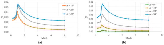 Lift (a) and Drag (b) coefficients versus Mach at α = 0°.