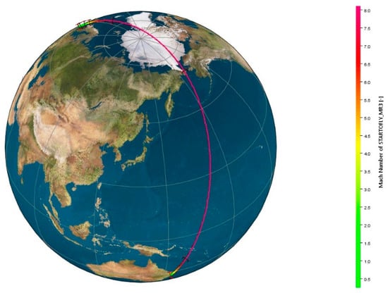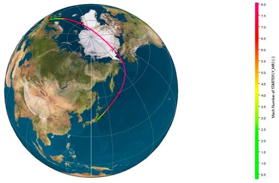 The mission profile (Figure 2b) is based on the LAPCAT reference [5]. During the first part of the mission the ATR engines are used and the vehicle performs the first climb phase, which terminates at Mach = 0.95 and at an altitude between 11 and 13 km. The air turbo–rocket (ATR) is a particular case of turbine-based combined cycles cycle engines which brings together elements of the turbojet and rocket motors and provides a unique set of performance characteristics. This engine offers a high thrust-to-weight ratio and specific thrust over a wide range of speed and altitude, constituting an excellent choice as an accelerator engine up to high-supersonic speeds. Then, the vehicle performs the subsonic cruise. This phase is needed to prevent a sonic boom while flying on land. A constraint on the distance flown from the departure site should be considered to fulfill this requirement: the subsonic cruise phase ends when the vehicle is at 400 km from the departure airport. Then, the supersonic climb starts, and the vehicle accelerates up to Mach = 4. At the end of this phase, the ATR engines are turned off and the DMR is activated to accelerate up to Mach = 8. Dual Mode Ramjet engine (DMR) is the high-speed engine that can be operated in both ramjet and scramjet modes. The next phase is the hypersonic cruise: in case of a Europe to Asia or Australia mission, the vehicle should point towards the Bering strait, then it flies over the Pacific Ocean to reach the designated destination. The cruise altitude should be in the range from 30 to 35 km. Eventually, the engines are turned off and the vehicle performs the descent towards the landing site.