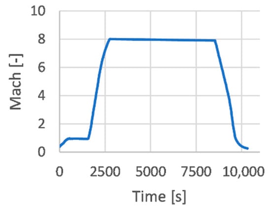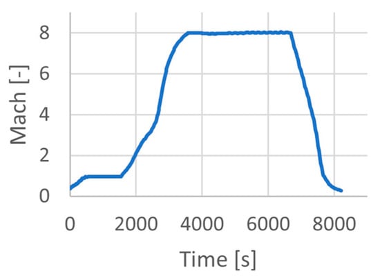 The Mach and altitude profiles are reported in Figure 16 and Figure 17. The vehicle performs the hypersonic cruise at M = 8 and an altitude that varies from 31 to 36.8 km. The latter altitude is higher than the 35 km maximum altitude of the reference mission profile and this is mainly due to the higher lift coefficient during the climb phase. The total mission time is equal to 2 h 52 m (10,300 s).
