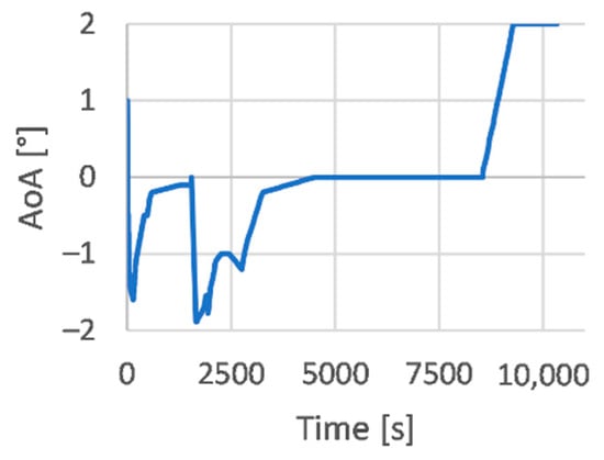 The angle of attack used during the simulation is reported in Figure 19. During the climb phases, the AoA is set to negative values to limit the excess of lift which is produced due to the large vehicle surface. If the vehicle flew at higher angles of attack, it would quickly increase its altitude. Conversely, during the unpowered descent, the AoA is set to the maximum value of 2°. During this phase, since the Lift-to-Drag ratio is very low, it is necessary to increase the lift generated by the vehicle as much as possible, to avoid a steep descent.