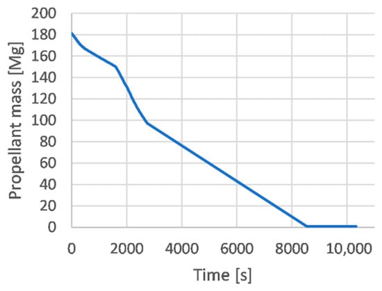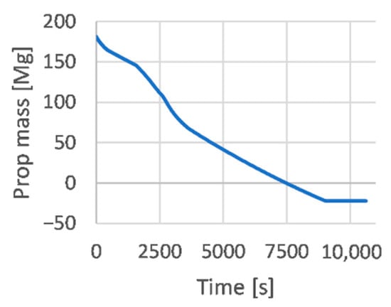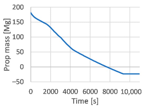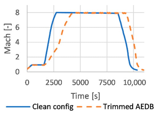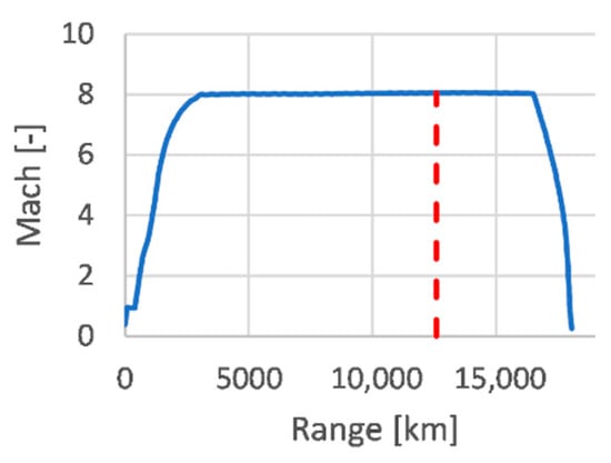 Once the aerodynamic analysis is complete, further mission simulations can be performed, considering the complete trimmed aerodynamic database. The reference trajectory is Brussels to Sydney and the other input parameters are the same used for the clean. The new simulation shows that the fuel consumption increases considerably during the entire mission, as reported in Figure 27. As a result, the vehicle runs out of fuel at approximately 7700 s (2 h 8 m), while flying the last part of the hypersonic cruise. It is worth noting that the propulsive database has remained unchanged in the simulations with clean configuration and trimmed aerodynamic database. Figure 28 shows the Mach number variation with range (i.e., the distance flown by the aircraft during the mission), and the vertical dashed line represents the point in which all the fuel is consumed. An estimation of the maximum range achievable in these conditions can be obtained from these results which is equal to approximately 12,200 km. However, it should also be highlighted that the ASTOS simulation can be continued even if the fuel mass becomes 0, so the results from that point on are not realistic.