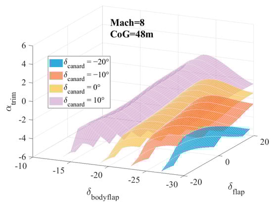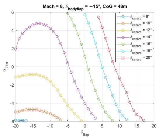 Then, the trim analysis can be performed. Among the full set of stable conditions evaluated during the previous step, it is possible to select the surfaces deflections and the corresponding angle of attack αtrim which guarantee CMy = 0. The first output of this analysis is a set of trim maps, as the ones reported in Figure 22 and Figure 23. The 3D map shows the resulting αtrim, which corresponds to the trimmed state, as a function of bodyflap and flap deflections, for Mach = 8 and CoG = 48 m. Each canard deflection δcanard is reported with a different color. Figure 23 also shows similar results. However, in this plot, the bodyflap deflection is fixed and the angle of attack αtrim varies only with the flap deflection δflap.