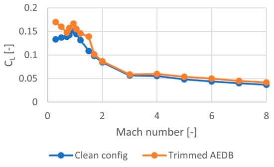CL vs. Mach comparison between clean configuration and trimmed case.