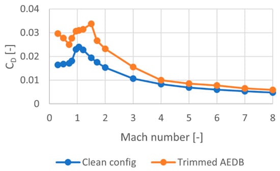 Eventually, the complete trimmed aerodynamic database can be derived and used to perform the mission simulation. The resulting CL, CD and L/D, at different Mach numbers and for AoA = 0°, are reported in Figure 24, Figure 25 and Figure 26 for the clean configuration and the trimmed case. The impact of the Control Surface deflections is clearly visible, especially for what concerns the increase in total drag and, consequently, the decrease in the aerodynamic efficiency along the entire Mach range. Eventually, an example of the database used in ASTOS is given in Table 4 where only some Mach numbers, representative of the different Mach regimes, are reported.