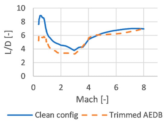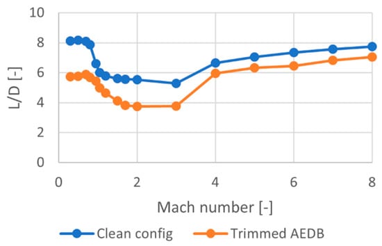 L/D vs. Mach comparison between clean configuration and trimmed case.