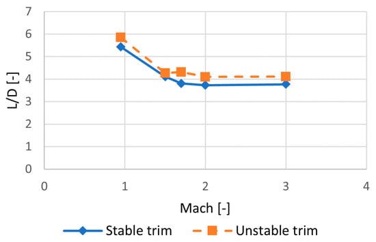 However, if the vehicle performance is improved, the fuel mass consumption could be reduced. A possible solution could be to relax the stability conditions in the Mach range from 0.95 to 3, where the lift-to-drag ratio reaches the lowest value. Therefore, the constraint on longitudinal static stability is removed and the trim conditions are evaluated again in this range, considering that . The resulting L/D is reported in Figure 31, where the continuous line represents the trim conditions with static stability and the dashed line refers to the unstable case. The aerodynamic efficiency is slightly increasing in this range, even if the increase is limited to values below 0.5.