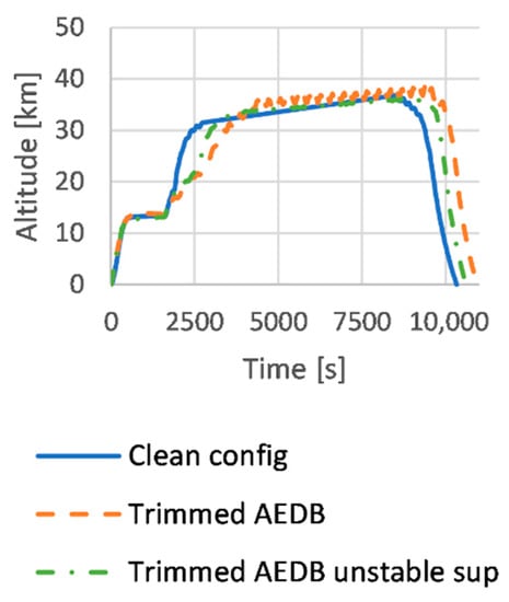 A further simulation is then run considering the unstable trim conditions from M = 0.95 to M = 3, while the same set of trim data is used for the other Mach numbers. The results are reported in Figure 32 and Figure 33 with the dash-dot line, where the altitude and Mach profiles are compared to the other cases. The time needed to perform the supersonic climb decreases to 1040 s, a mid-value with respect to the two previous cases. However, a significant difference still exists if compared to the clean configuration mission profile.