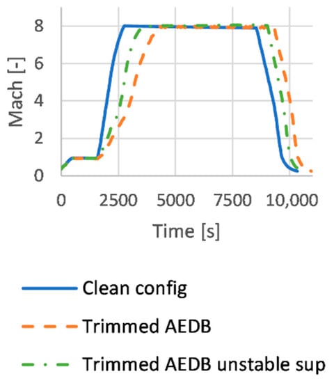 The time needed to perform the climb phase is increasing considerably with respect to the previous simulation (Figure 29). This increment is due to the reduced aerodynamic performances, if compared to the clean configuration, as reported in Figure 30. The trimmed aerodynamic performances are poorer compared to those of the clean configuration: the L/D ratio ranges between 5 and 6 in the subsonic regime, while it drops below 3.5 during the supersonic climb.