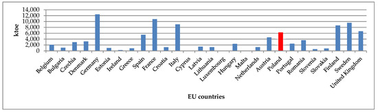 Biomass is an organic substance created in the process of accounting solar energy [6]. Biomass also includes processed forms, such as pellets and briquettes [65]. Poland ranks seventh in terms of gross energy availability from solid biofuels in the EU (approx. 6.2 Mtoe) (Figure 2)
