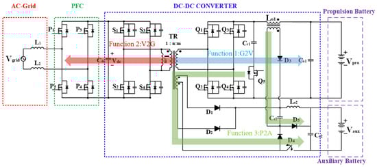 The energy storage system in Electric Vehicles (EVs) and Plug-in Hybrid Electric Vehicles (PHEVs) normally consist of two kinds of batteries (400 V high voltage battery and 24 V or 48 V low voltage battery). One is the propulsion battery to provide a high DC voltage for the electric motor and the other is the auxiliary battery to supply a low DC voltage for the low voltage electric devices such as the lighting, entertainment, signaling circuit and audio systems. In order to charge those two batteries, in general, two different converters are required: an On-Board Charger (OBC) for the propulsion battery and a Low-Voltage DC/DC Converter (LDC) converter for the auxiliary battery. In the conventional DC-DC converter systems on EVs or PHEVs, since these two converters operate separately, the size of the DC-DC converter system becomes bulky. In order to cope with this problem, an integrated OBC has been introduced by combining the OBC converter with the LDC converter to achieve a smaller volume, lighter weight and lower cost. An integrated OBC converter can perform three different functions: (1) charge operation from Grid-to-Vehicle (G2V), (2) discharge operation from Vehicle-to-Grid (V2G) [] and (3) charge operation from Propulsion Battery to Auxiliary Battery (P2A).