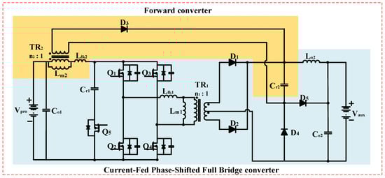 The proposed LDC converter is a combination of a forward converter and a PSFB converter with a high step-down voltage conversion ratio as compared to the converter introduced in []. In order to explain the characteristics of the proposed LDC converter in terms of voltage conversion ratio its simplified circuit model is shown in Figure 5.