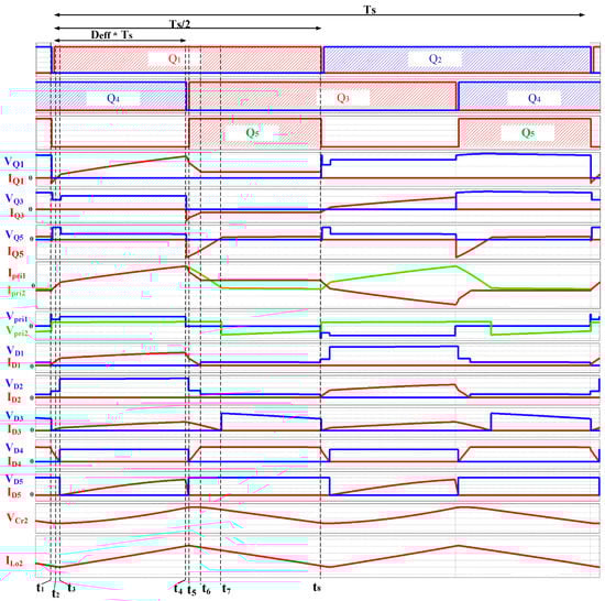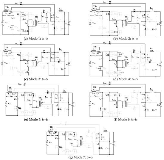 The circuit diagram of the LDC converter in the proposed integrated OBC is shown in Figure 2. The primary side is composed of an input capacitor Co1, an active clamp circuit with Cr1 and an active switch Q5 and a PSFB converter with switches Q1, Q2, Q3 and Q4. The transformer of the PSFB converter is TR1 with a magnetizing inductance Lm1, a leakage inductance LLK1 and a turns ratio of n1:1. The transformer of the forward converter is TR2 with a magnetizing inductance Lm2, a leakage inductance LLK2 and a turns ratio of n2:1. The secondary side of the PSFB converter includes rectifier diodes D1 and D2, a passive snubber circuit composed of Cr2, D4 and D5. The capacitor Cr2 connected in parallel with the output inductor LO2 also plays a function as an output capacitor of the forward converter and reduces the current ripple of the output. As mentioned earlier, the focus is on explaining the operation of the LDC of the proposed integrated OBC. Here, a half of the switching cycle of the proposed converter is divided into seven modes and the operation is explained in detail since the other half is symmetric. The key waveforms and the equivalent circuits of each operation mode are shown in Figure 3 and Figure 4, respectively. For the sake of simplicity, all of the circuit components are ideal except the output capacitance of the switch and all of the output capacitances of the switches are assumed to be same.