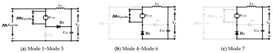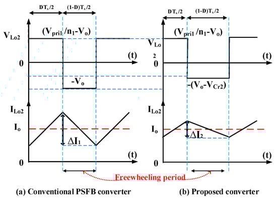 In the conventional PSFB converter, the amplitude of the voltage applied to the output inductor in the powering period is the same as in the freewheeling period, as shown in Figure 8a. However, in the proposed converter, due to the operation of the forward converter, as explained in mode 5 to mode 7, the voltage applied to the output inductor during the freewheeling period is reduced since the diode D5 is reverse biased, as shown in Figure 8b. As a result, the current ripple of the output inductor can be reduced significantly.