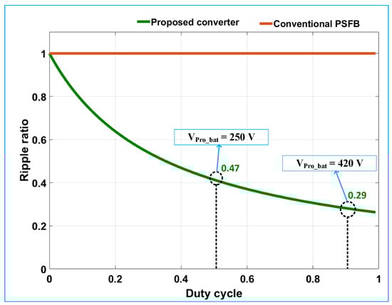 Figure 9 illustrates the ratio of current ripple between two cases with different values of the effective duty cycles. When the voltage of the propulsion battery is 420 V, the duty of the LDC is 0.9 and the current ripple of the output inductor LO2 of the proposed converter is just 29% of that of the conventional PSFB converter. When the voltage of the propulsion battery is 250 V, the current ripple of the output inductor LO2 is just 47% of that of the conventional PSFB converter. Therefore, the value and size of the output filter inductor LO2 can be significantly reduced.