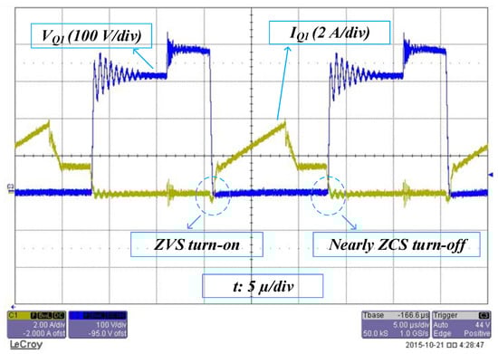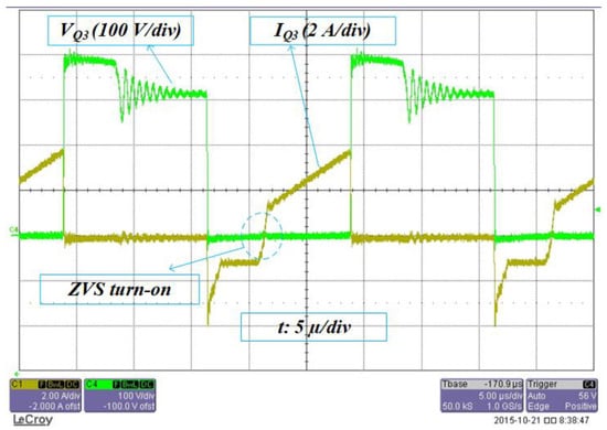 Figure 12 shows the waveform of MOSFET Q1 at the light load condition (10% load) with an input voltage of 330 V and output power of 100 W. It can be clearly observed from Figure 12 that the lagging leg switches can maintain ZVS turn-on and nearly ZCS turn-off at light load condition.