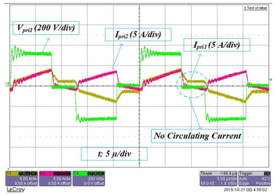 Figure 13 represents the voltage and current waveforms of the transformer TR1. It can be observed that there is nearly no circulating current in the primary side of the transformer TR1 during freewheeling interval.