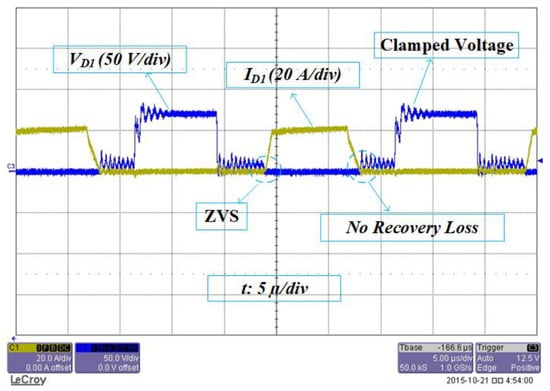 The measured waveforms at diode D4 are shown in Figure 18. Both ZVS turn-on and ZCS turn-off are achieved at diode D4, thus there is no recovery loss at this diode.