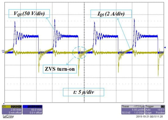 The measured waveforms at diode D3 are shown in Figure 16. It can achieve both ZVS turn-on and ZCS turn-off. The voltage across the diode D3 oscillates due to the leakage inductance of the transformer TR2. Figure 17 shows the current and voltage waveforms at the active clamp switch Q5 with ZVS turn-on.