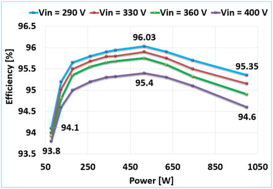The efficiency during function III operation with a wide range of input voltage variation is measured and shown in Figure 19 with the wide input voltage variation from 290 V to 400 V. The proposed converter shows a high efficiency all over the load range and the maximum efficiency is 96.03% at 500 W, which is much higher than those of conventional ones in [,,].