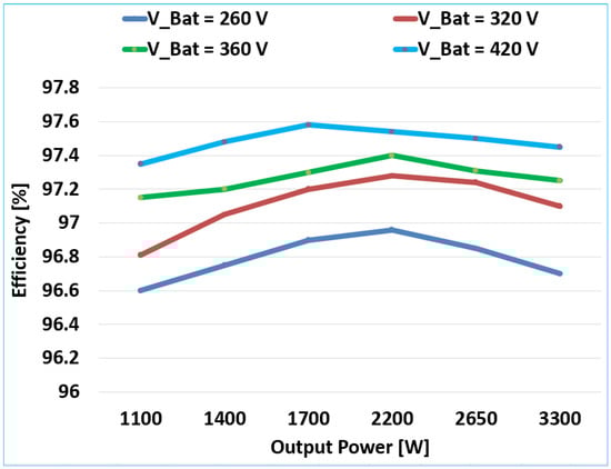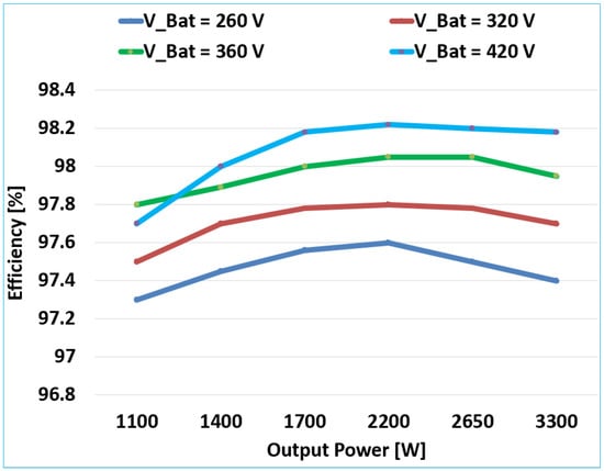 The efficiency during function I and function II operations is also shown in Figure 20 and Figure 21, respectively. In function I, the maximum efficiency is 98.2% when VDC = 400 V, VDC = 420 V and PO_I = 2.3 kW. In function II, the maximum efficiency is 97.58% when VDC = 400 V, VPro_Bat = 420 V and PO_II = 1.8 kW.