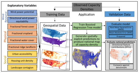 Schematic showing the data-driven workflow used to generate spatially-explicit predictions of capacity density for the United States (U.S.). We compile observed capacity densities for a comprehensive set of operational wind farms in the U.S. and associate those with geospatial variables characterizing physical, social, and environmental drivers that explain geographic variation in capacity density. The boosted regression tree model is trained using a subset of the observations and validated against independent test data to assess its ability to generalize to other locations. We use the validated model to generate a national map of capacity density and apply evaluation techniques to interpret and compare our predictions against a standard benchmark that assumes spatially-uniform capacity densities. Workflow visualization inspired by Lee et al. [49].