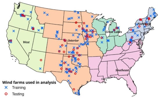Spatial distribution of wind farm facilities used in model training and testing. Centroids of selected wind farms from the U.S. Wind Turbine Database [50] are displayed here in tandem with wind regions defined by the Department of Energy’s Office of Energy Efficiency and Renewable Energy (DOE EERE) [2]. As shown here, training and testing datasets were each designed to include observations of wind farms located in all regions of the country. This selection was done to minimize geographic biases that could otherwise limit the ability of the model to generalize across regions.